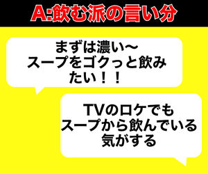 スープから飲む派にも、飲まない派にも、それぞれにしっかり理由があって、どちらが正解とも言い切れないのが面白いところですね。