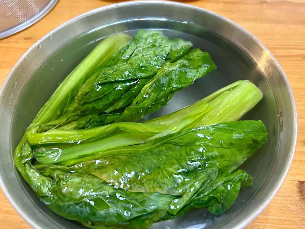 加熱が終わったらすぐに冷水にとって粗熱を取り、色よく仕上げてからよく絞り、食べやすい大きさに切ります。