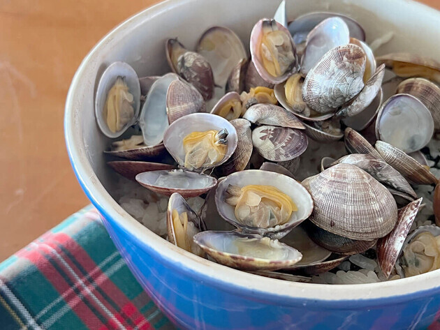 あさりは砂出しし、流水でこすり洗いをします。