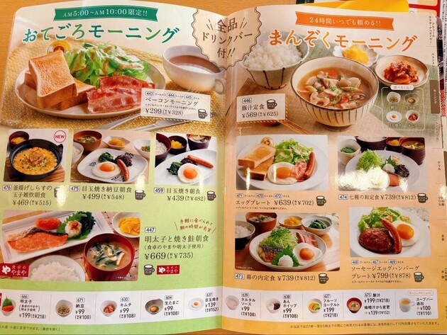 今回は、「24時間満足モーニング」から洋食と和食メニューを2つ食べてみました。
