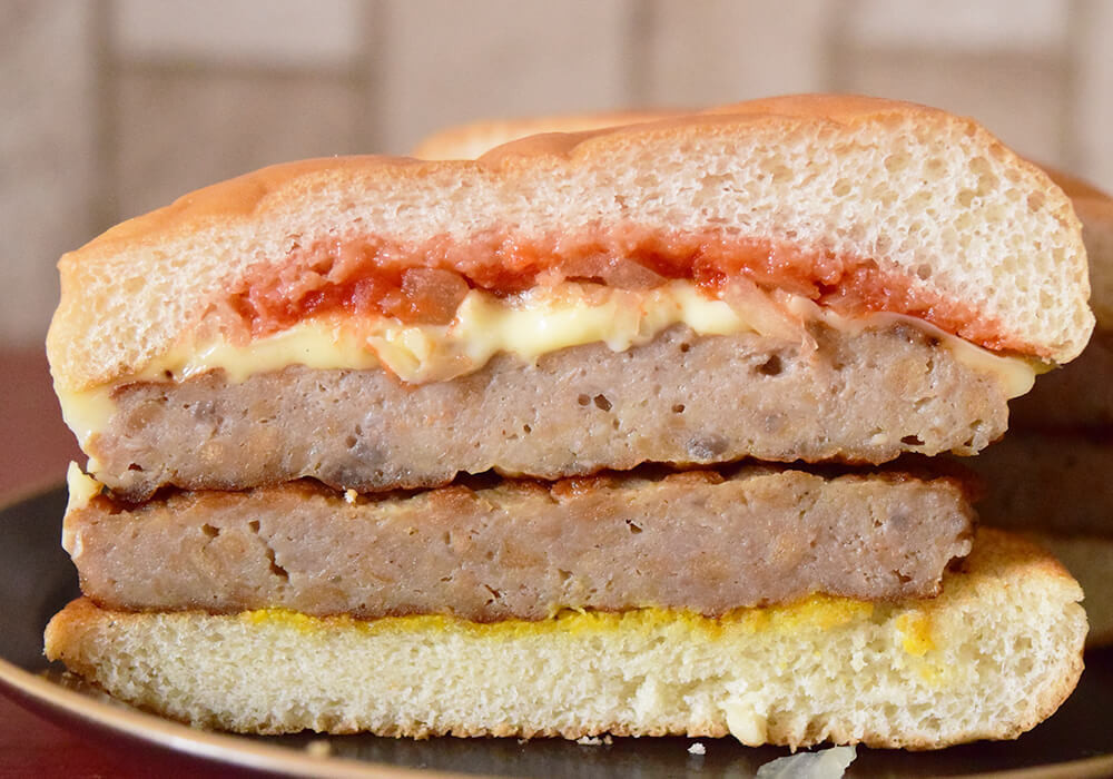肉厚で食べ応えは十分ですが、口当たりはやわらかく、いわゆる肉感はやや控えめに感じられます。チーズの風味はほどよく効いています。