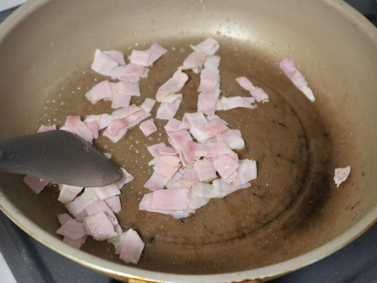 フライパンにオリーブオイルを入れて熱し、ベーコンを炒めます。