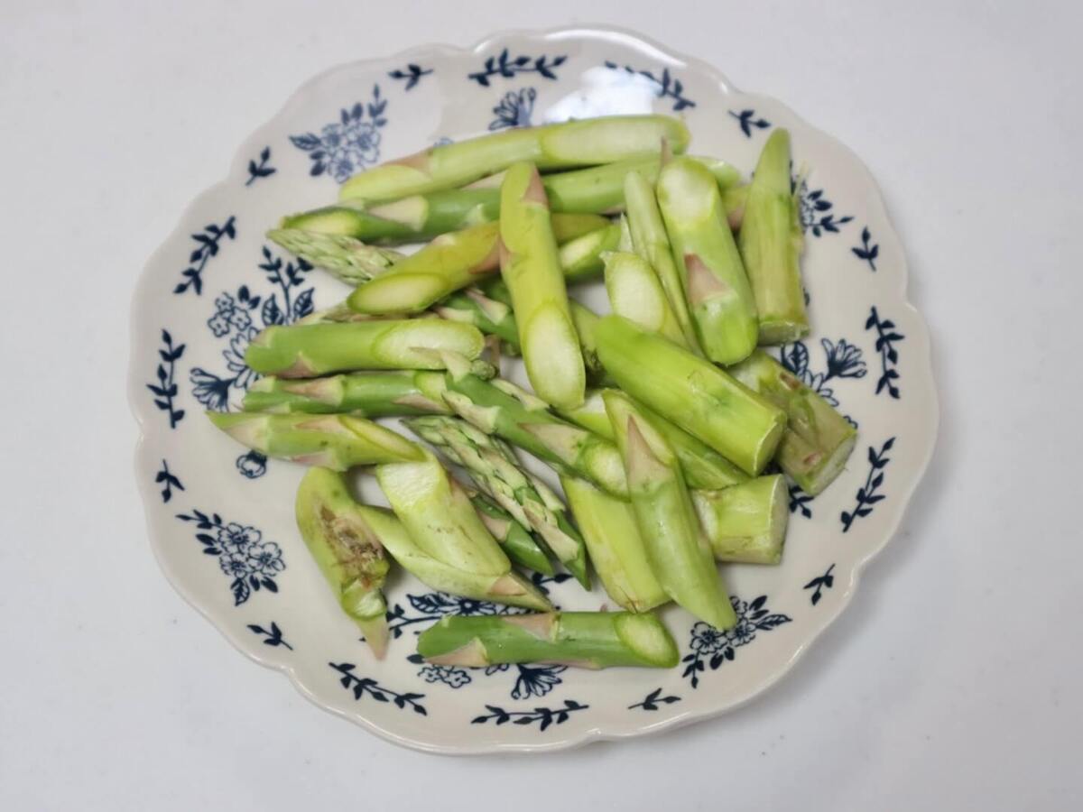 アスパラは根元のかたい部分を切り落とし、根元5cmをピーラーでむき、食べやすい大きさに斜め切りにします。