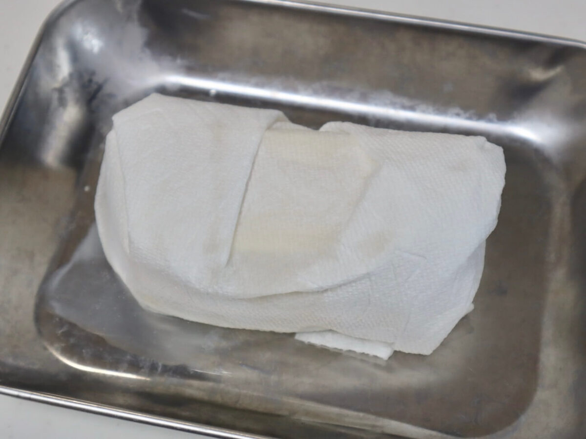 木綿豆腐はキッチンペーパーで包み、軽く水気を切っておきます。