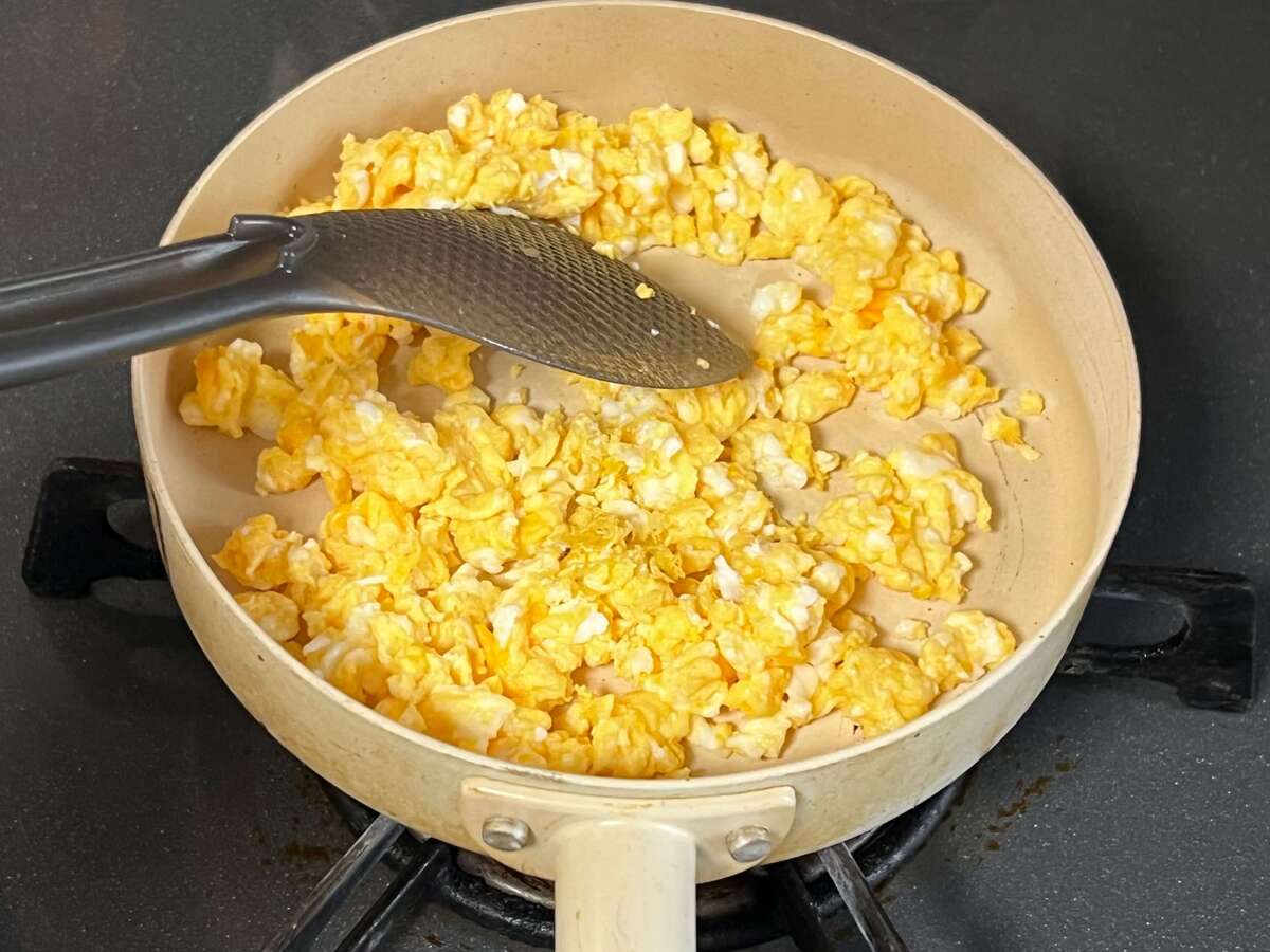 同じフライパン、または別のフライパンに溶いた卵を入れ、そぼろ状に炒めます。