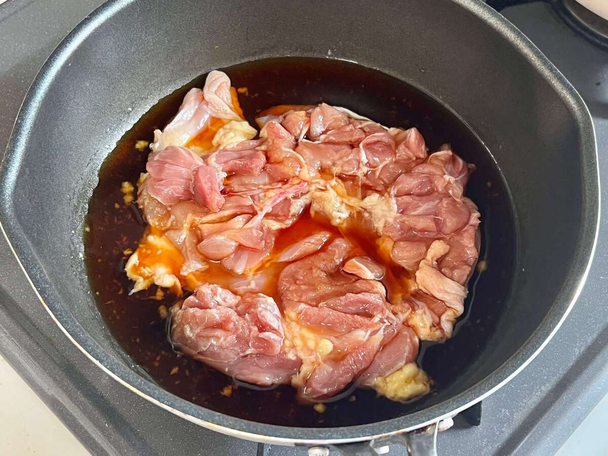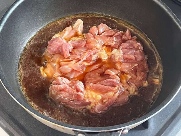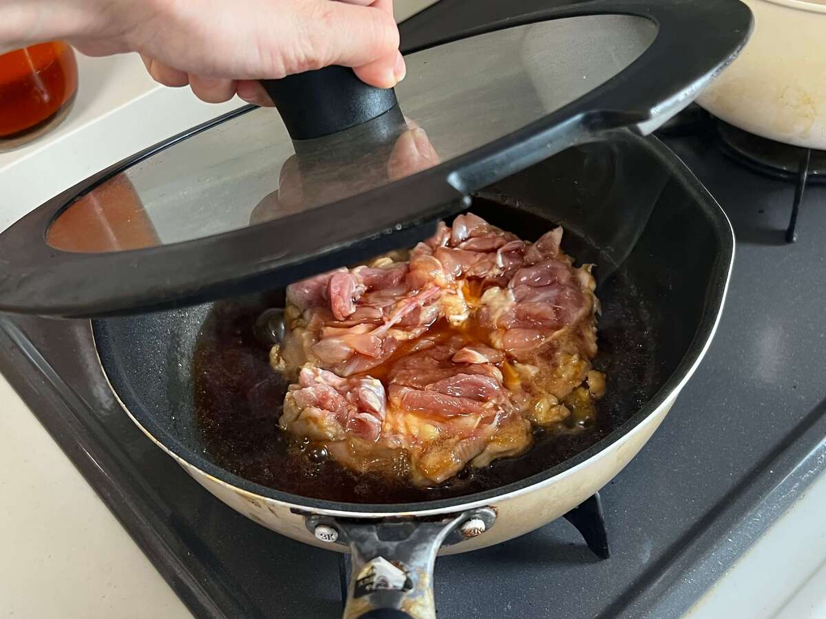鶏もも肉を入れたらすぐに調味料を加えてOKなので、調理工程が少なくてありがたい♡