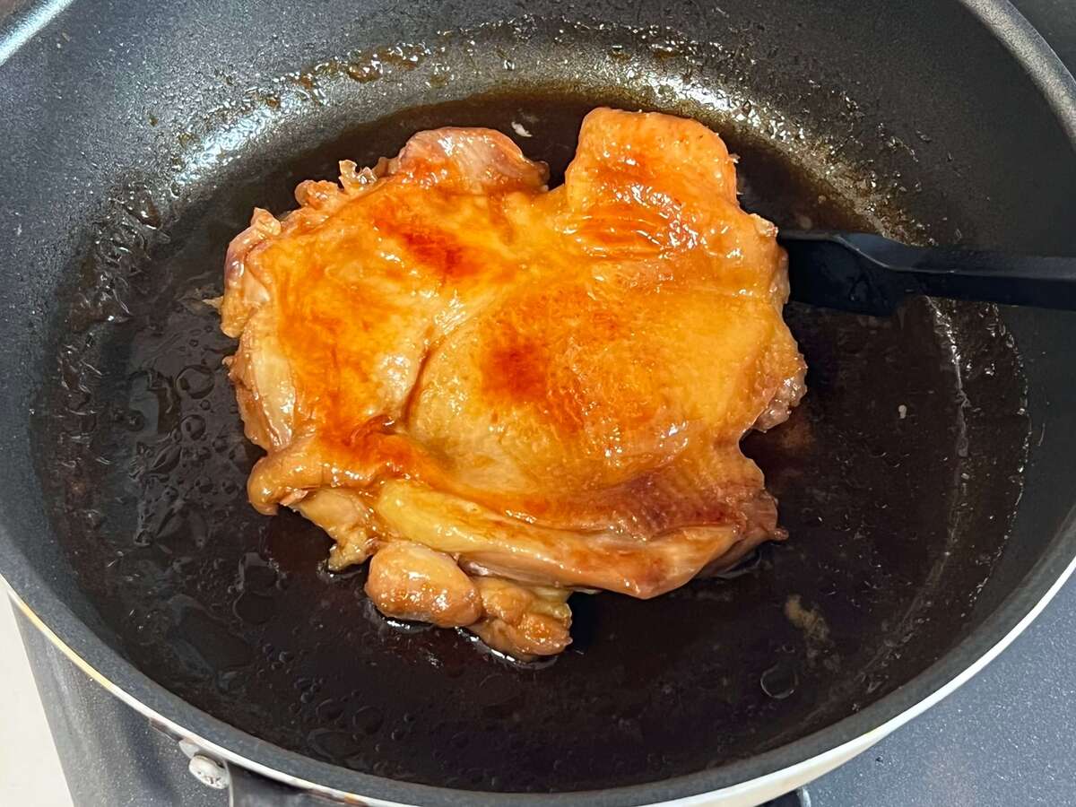鶏もも肉1枚がすっぽりおさまる20cmのフライパンを使ったことや、フタをして水分を逃さなかったことで、短時間なのにもかかわらずタレが鶏もも肉の全体に染み込んでふっくらジューシーな仕上がりになるんです♪
