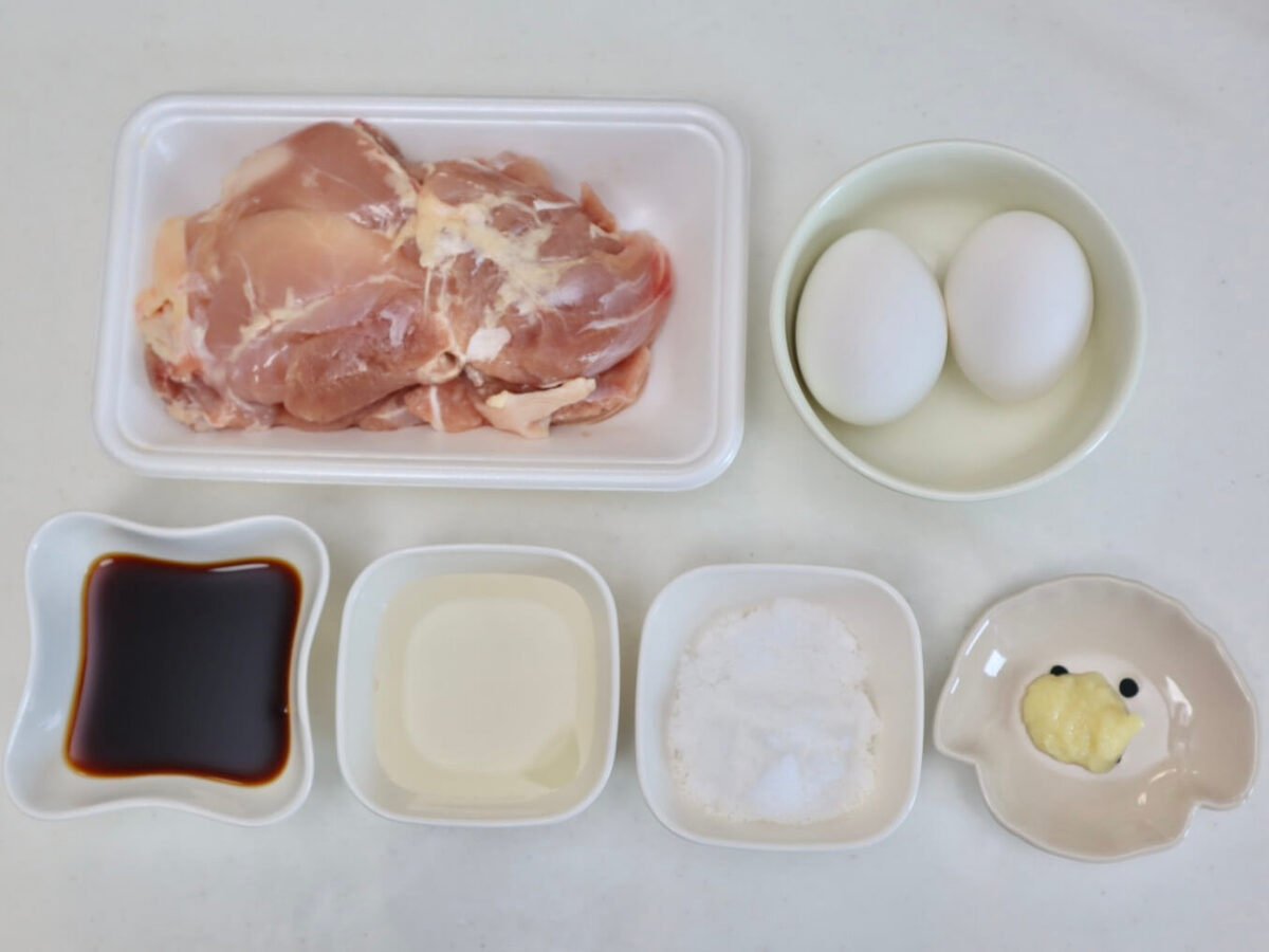 鶏もも肉を取り出して食べやすい大きさに切り、ゆで卵は半分にカット。