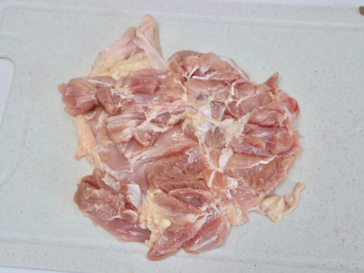 鶏もも肉は内側に切り込みを入れて、1.5cmほどの厚さになるよう均一にしておきます。
