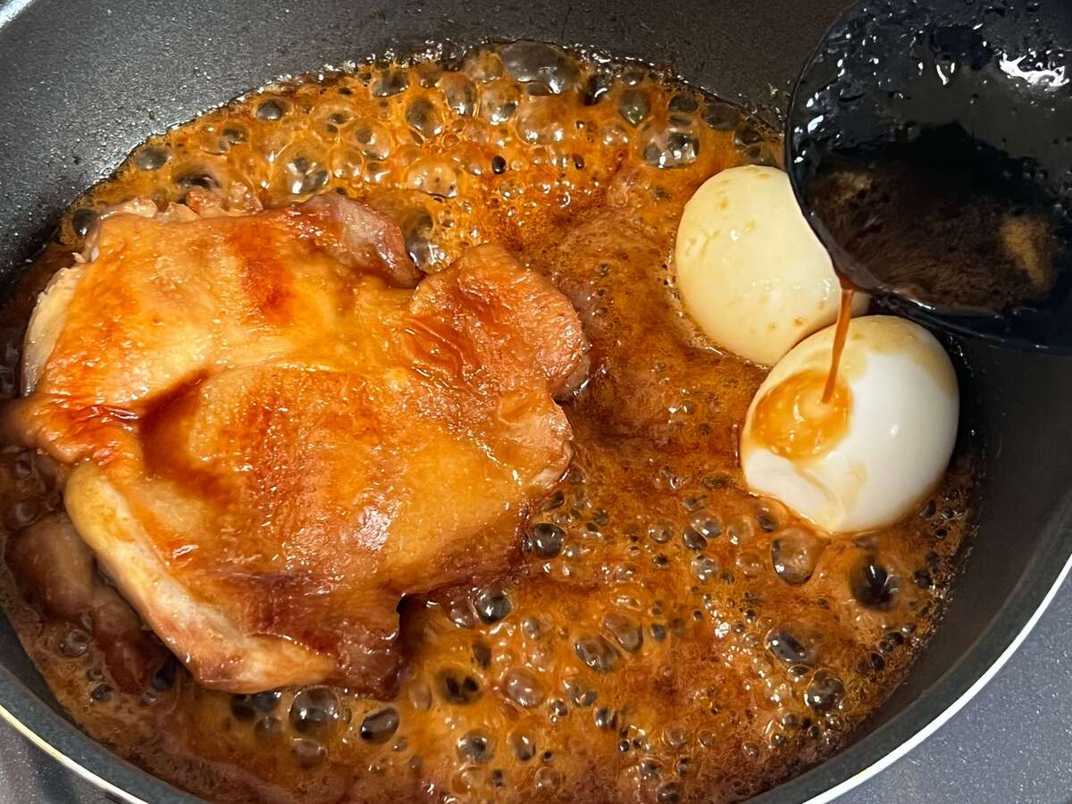 鶏もも肉とゆで卵にスプーンでタレをかけながら、中火で1分ほど煮詰めましょう!