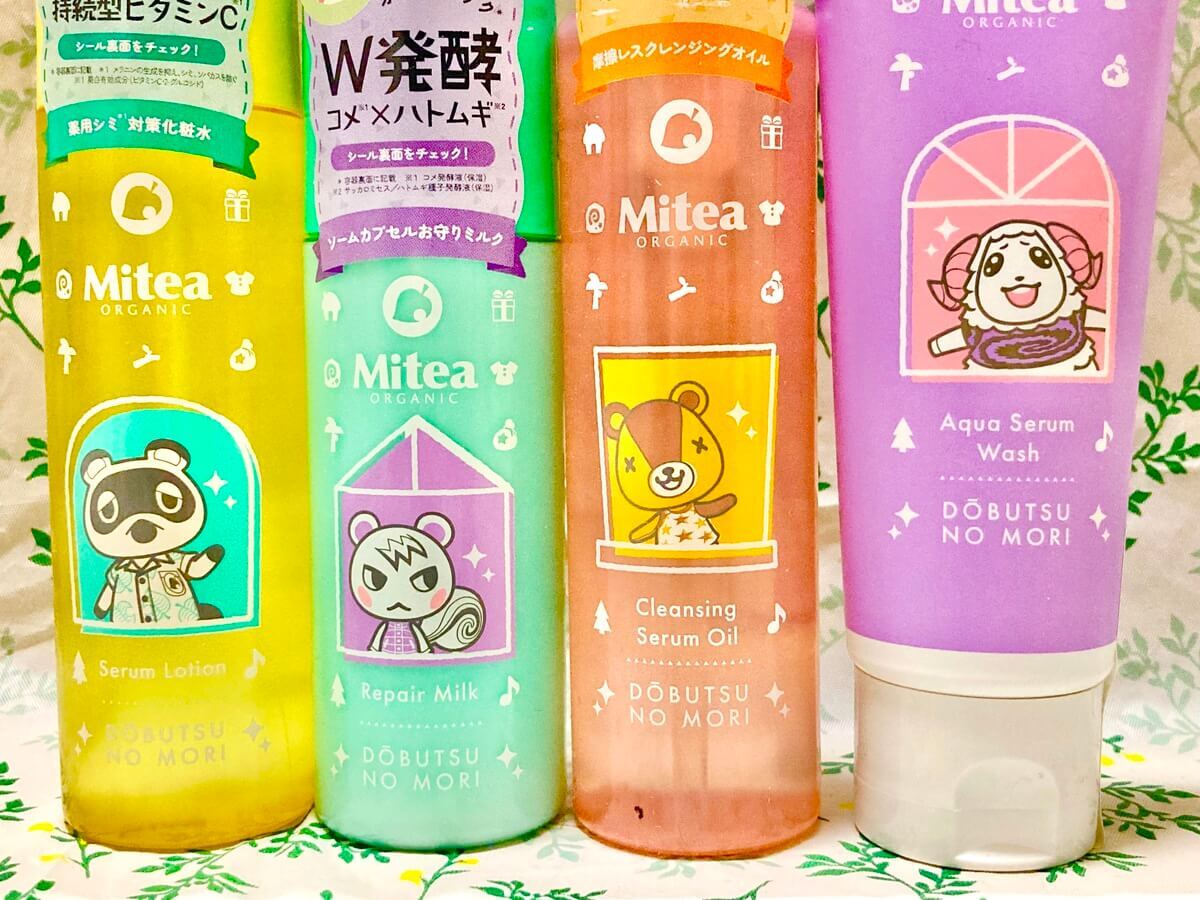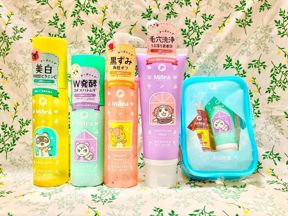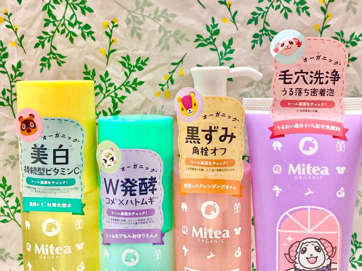 「Mitea ORGANIC」と「どうぶつの森」のコレクションも展開されます。窓からのぞくどうぶつたちと、カラフルなパッケージが印象的で、毎日のスキンケアやメイク時間を楽しくしてくれそうなシリーズです。