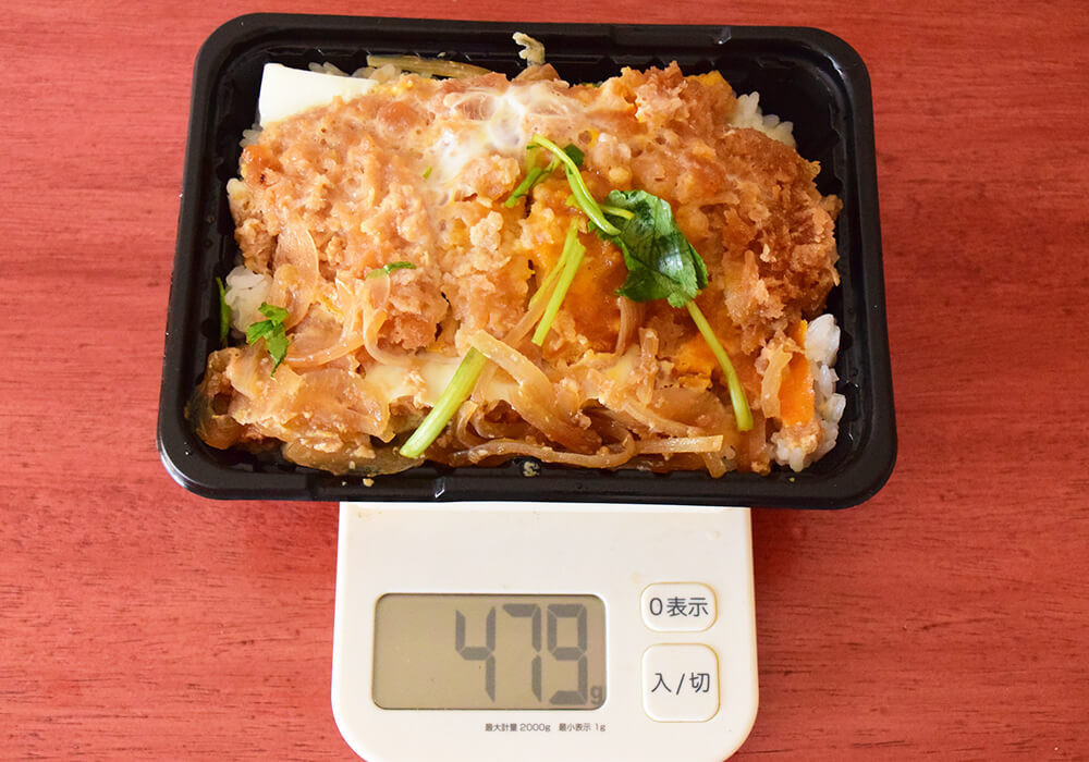 容器込みの重量は479g。トライアルや西友の「カツ丼」と比べると価格はやや高めですが、それでも300円台をキープしている点は、十分にコストパフォーマンスが高いと言えます。
