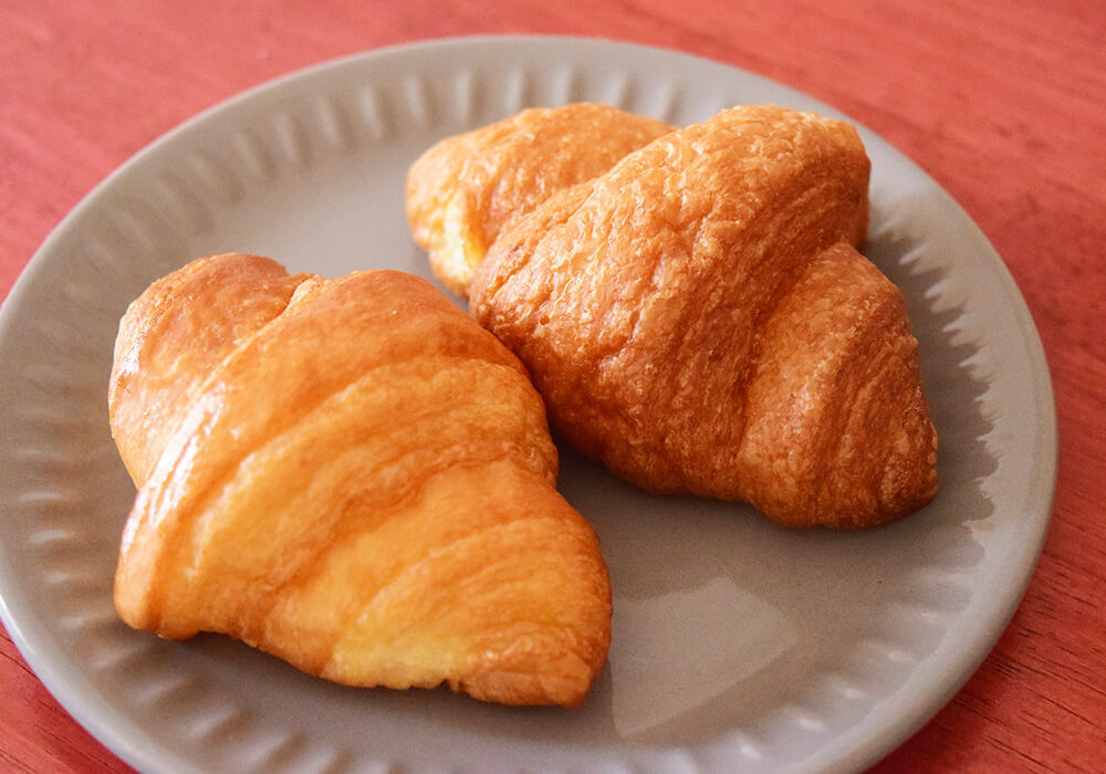 ミニクロワッサンは、バターの風味がじゅわっと広がる王道のおいしさ。今回は電子レンジで軽く温めてから食べたため、表面はしっとりとした食感に仕上がっていましたが、十分満足できる味わいです。そのままでもおいしくいただけますが、ハムや野菜を挟んでアレンジしても楽しめそうです。