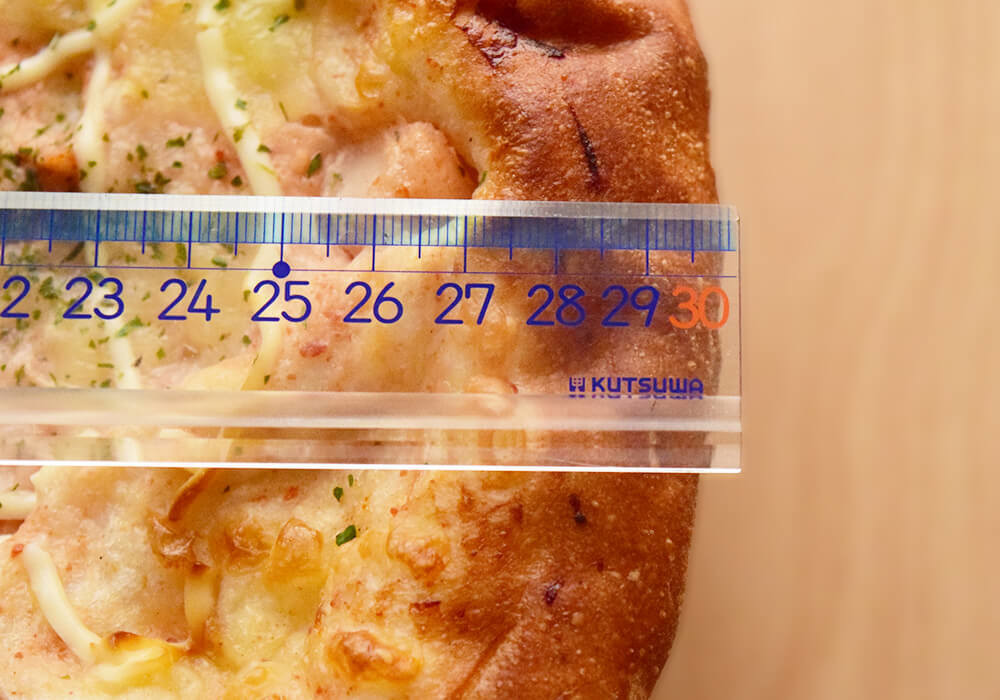 実際に直径を測ってみたところ、約30cmありました。テレビ用の演出ではなく、本当に大きなピザで、持ち帰るのも大変でした。