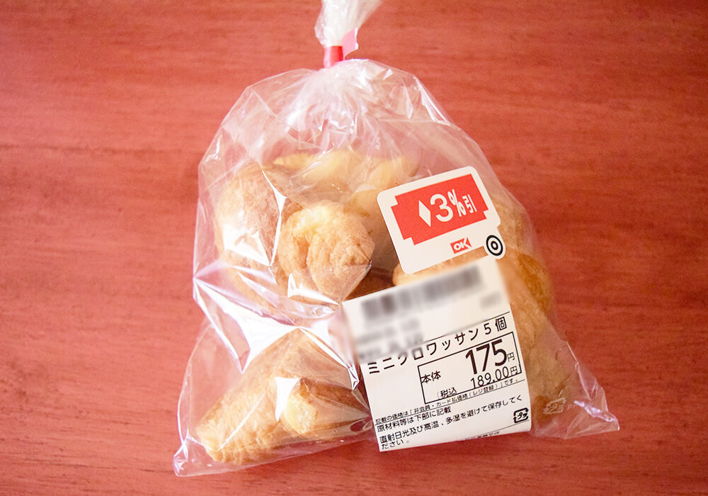 そのため、今回はオーケーで年間販売数1000万個を突破している人気商品「ミニクロワッサン」を購入してみることにしました。ちょうど賞味期限が近いものがあり、3%引きで購入できたのはラッキーでした。