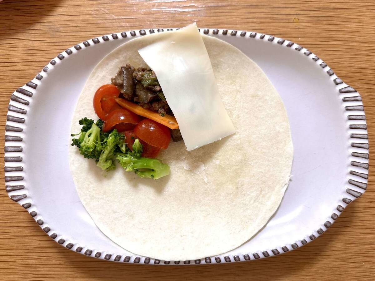 前日の夕飯の残りの青椒肉絲と、息子のお弁当の残りのブロッコリーとミニトマト、あと冷蔵庫にあったスライスチーズ。支離滅裂な組み合わせですが、ここにサルサソースをかければ、まとまりができて美味しくなるんですよ!