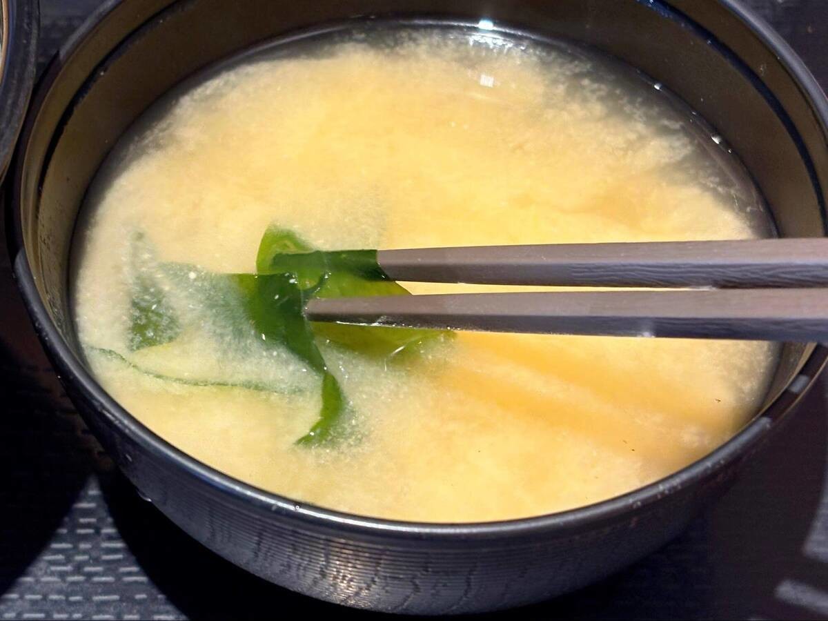 みそ汁はワカメ入り。塩味が控えめで、どこか落ち着く味わいです。おかずと合わせてもくどくならず、相性抜群。