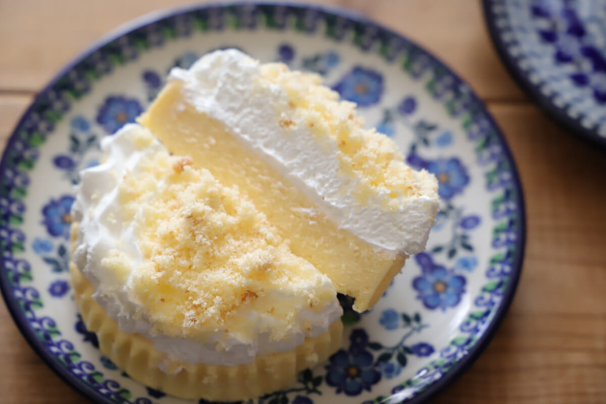 断面を見てみると、レアチーズケーキとベイクドチーズケーキが二層になっています。