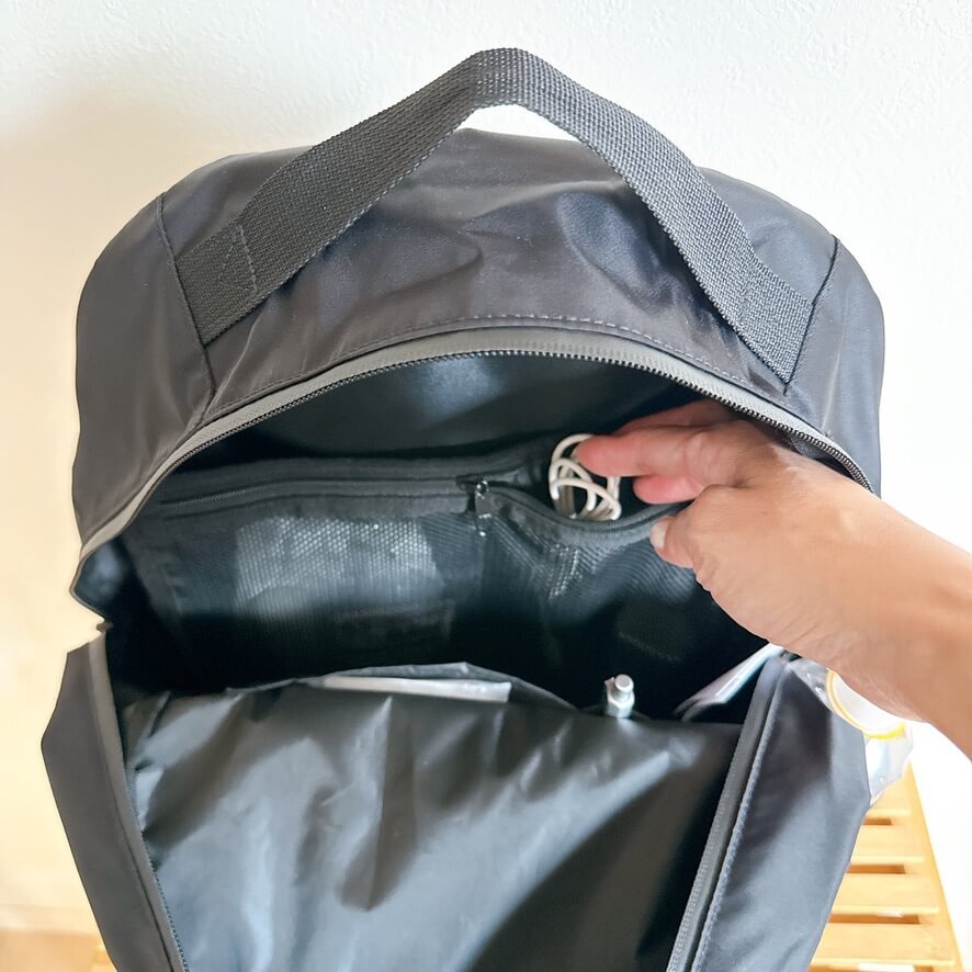 縦チャックのフロントポケットは見た目よりずっと奥行きがあります。上着やタオルも入りそう。