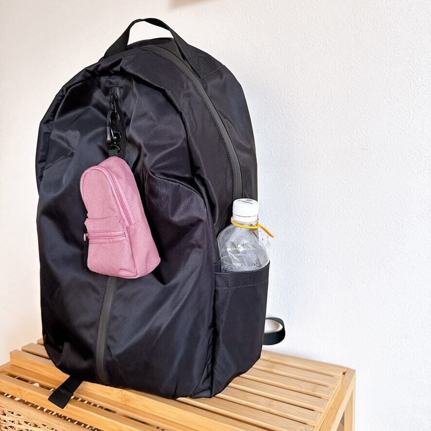 スタイリッシュなリュックにはサイドポケットがないものが多かったけれど、これは両サイドにしっかりポケットがあって、ペットボトルも入る。
