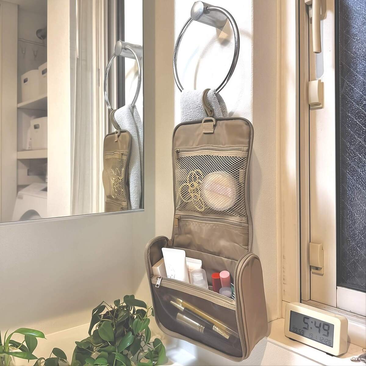 これ、フックに吊るすだけで即席の洗面スペースができます。必要なものがひと目でわかるし、水回りに直置きしないからごちゃつかない。