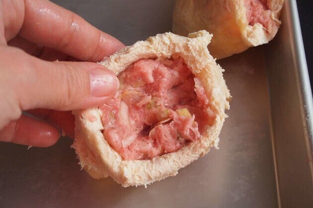 肉だねを詰めた後に少し平らにすることで火の通りが良くなり、レンジ加熱でも生で仕上がるのを防いでくれるという実践的なテクニック。