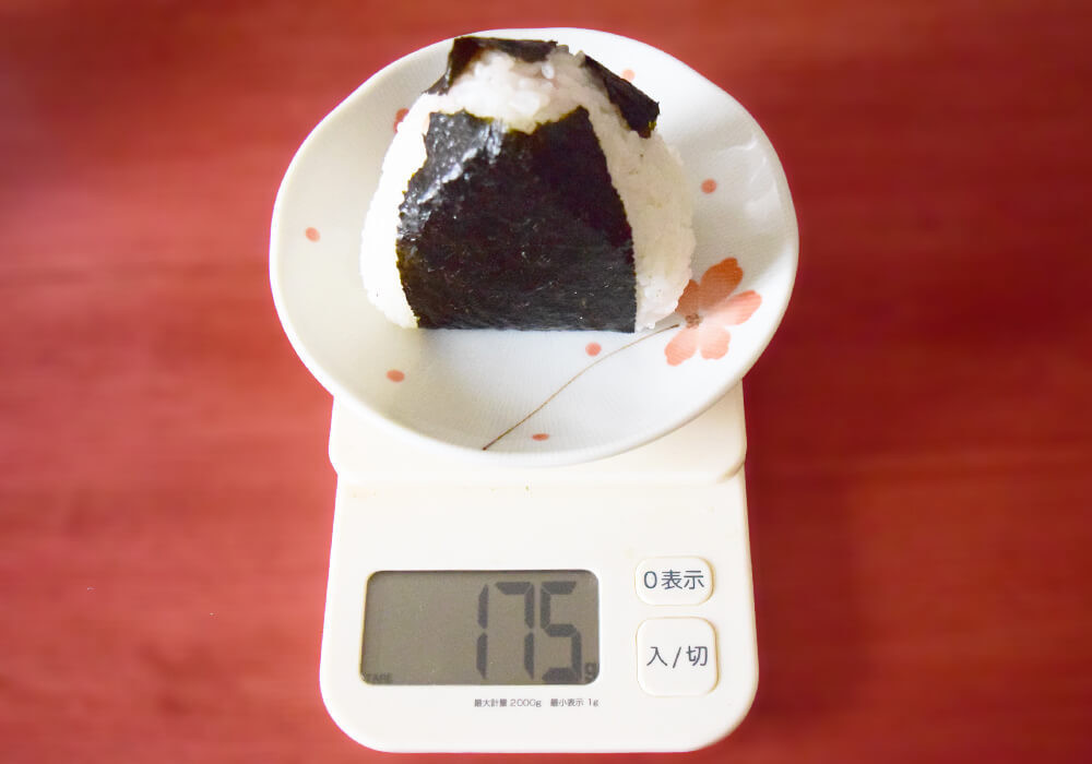 お皿の重さを抜いた重量は175g。一般的なコンビニおむすび(約100〜120g前後)と比べてもかなりボリュームがあり、1個でもしっかり満足感を得られるサイズ感です。
