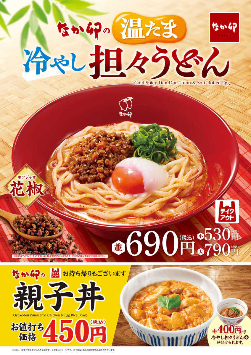 また、「親子丼(税込450円)」を注文した場合はプラス400円で「冷やし担々うどん:小」を付けることが可能!