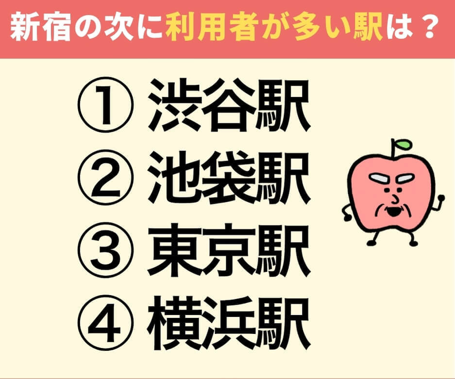 新宿駅には、JR・私鉄・地下鉄あわせて1日約298万人が乗り降りしています。では、この新宿に次いで利用者が多い駅は、次のうちどれでしょうか?