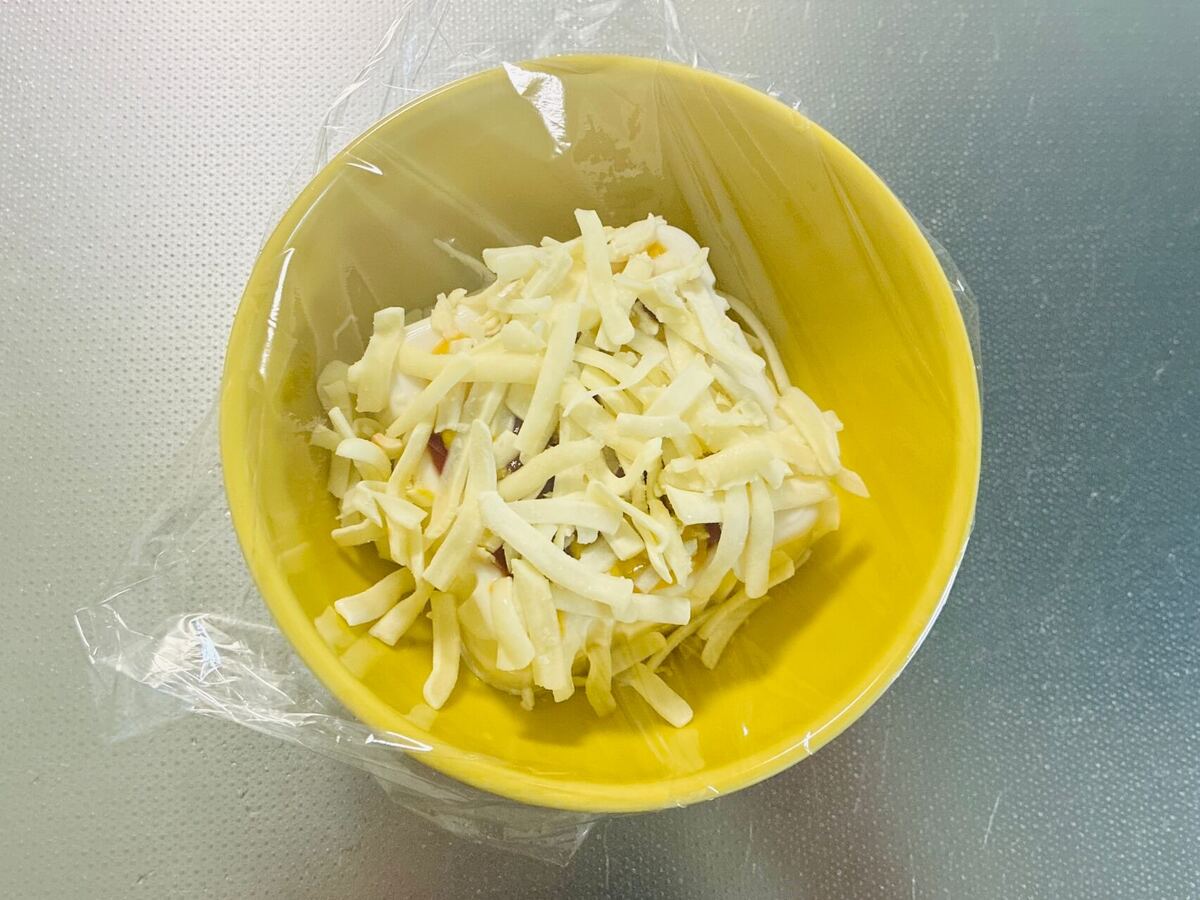 作り方②ピザ用チーズをのせて、電子レンジ加熱する
