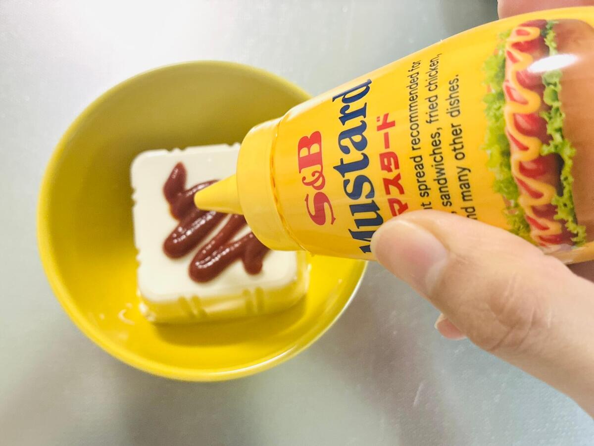 作り方①充填豆腐にケチャップとイエローマスタードをかける