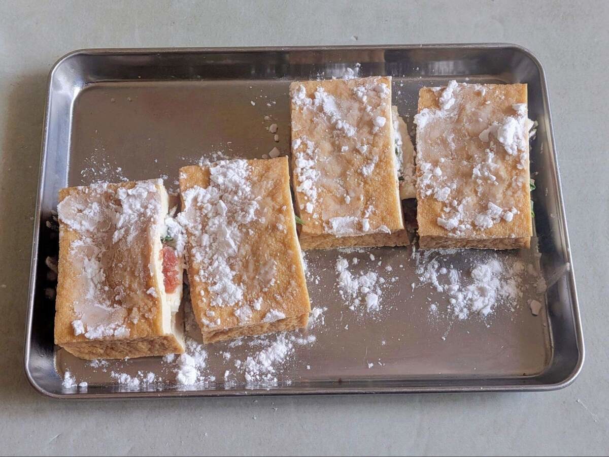 ここが不器用な私にとって最もドキドキする工程。しかし、入れ込む具材の量がちょうど良く、厚揚げを破くことなく挟めました!