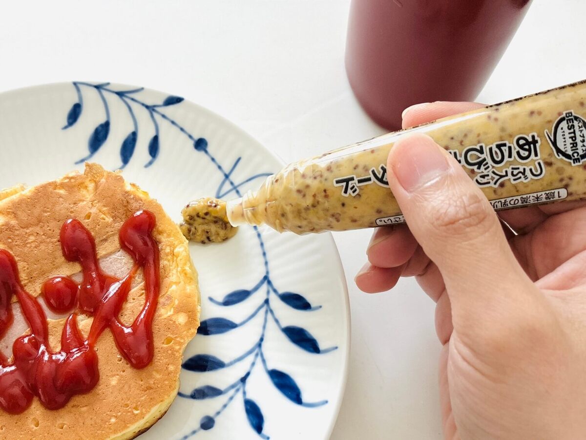 さらにアメリカンドッグに寄せていくのであれば、やはり粒マスタードをつけるのが正解!個人的には、これでいっきに近づいたように感じました。