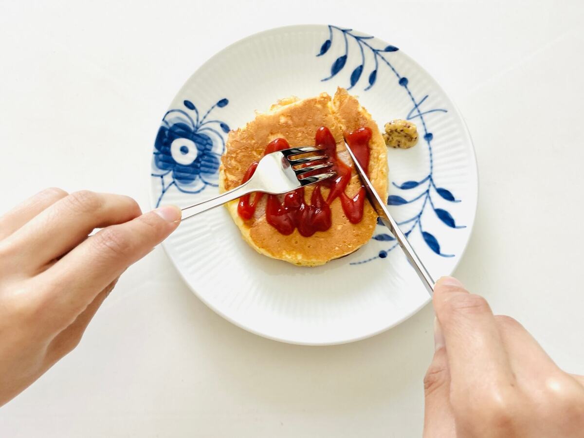 想像以上にケチャップをかけてしまった……と思いましたが、むしろそれぐらいがちょうどよかったのかもしれません。ホットケーキとケチャップの相性はGOOD!