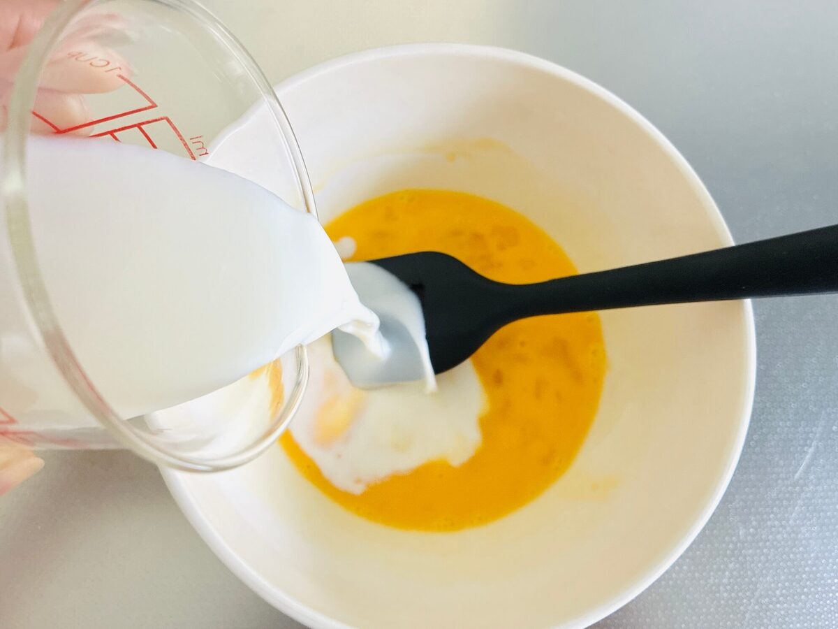ボウルに卵を溶き、牛乳を混ぜます。