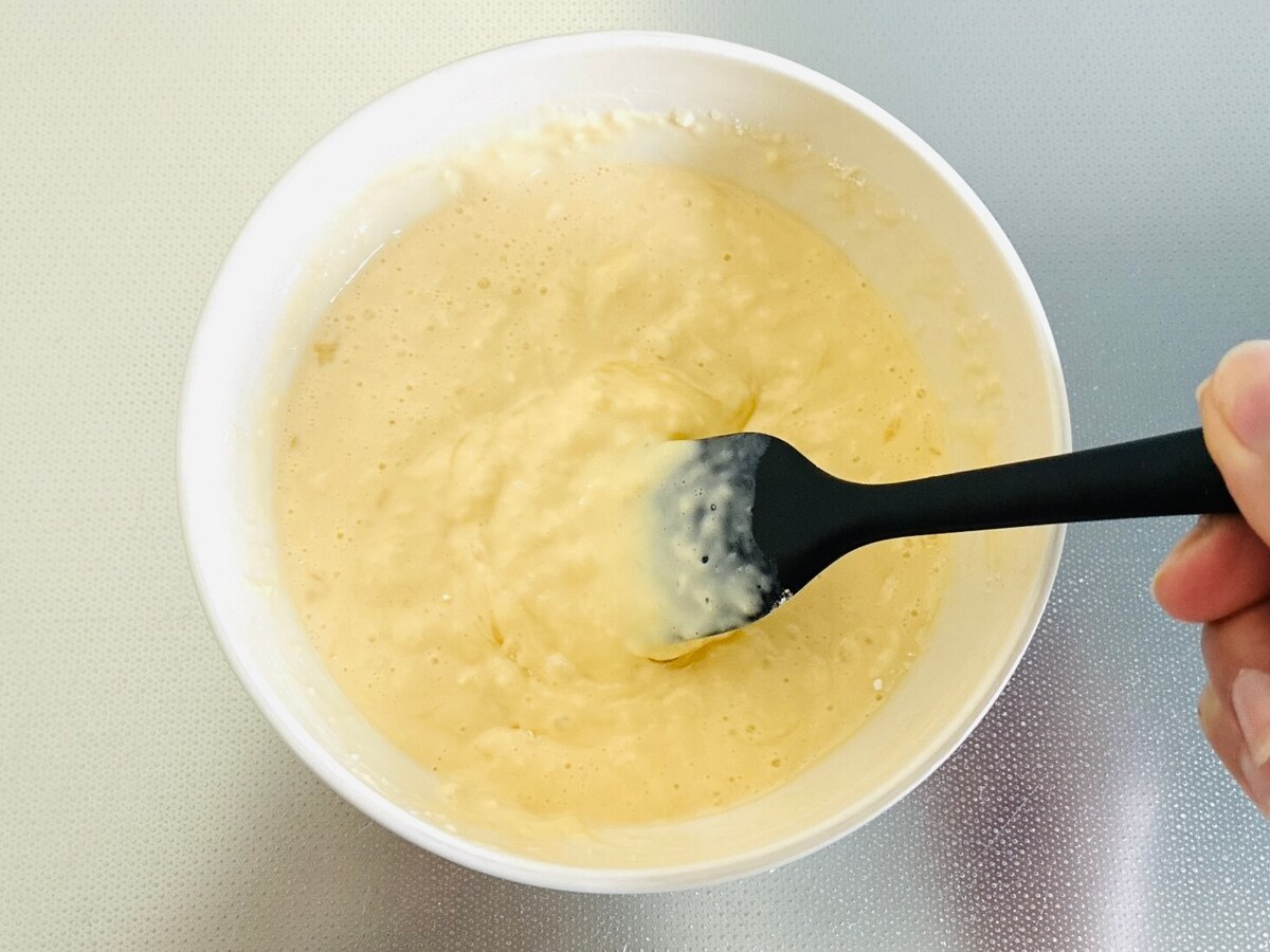 ホットケーキミックスを加えて、さっくりと混ぜ合わせます。