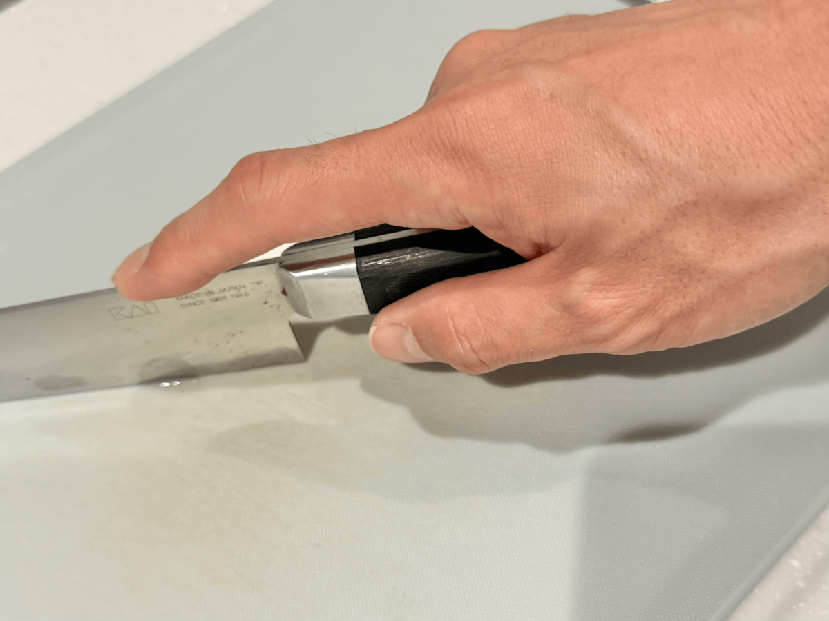 包丁は「グリップ部分の一番前」を親指と人差し指で挟むように持つのが正解。