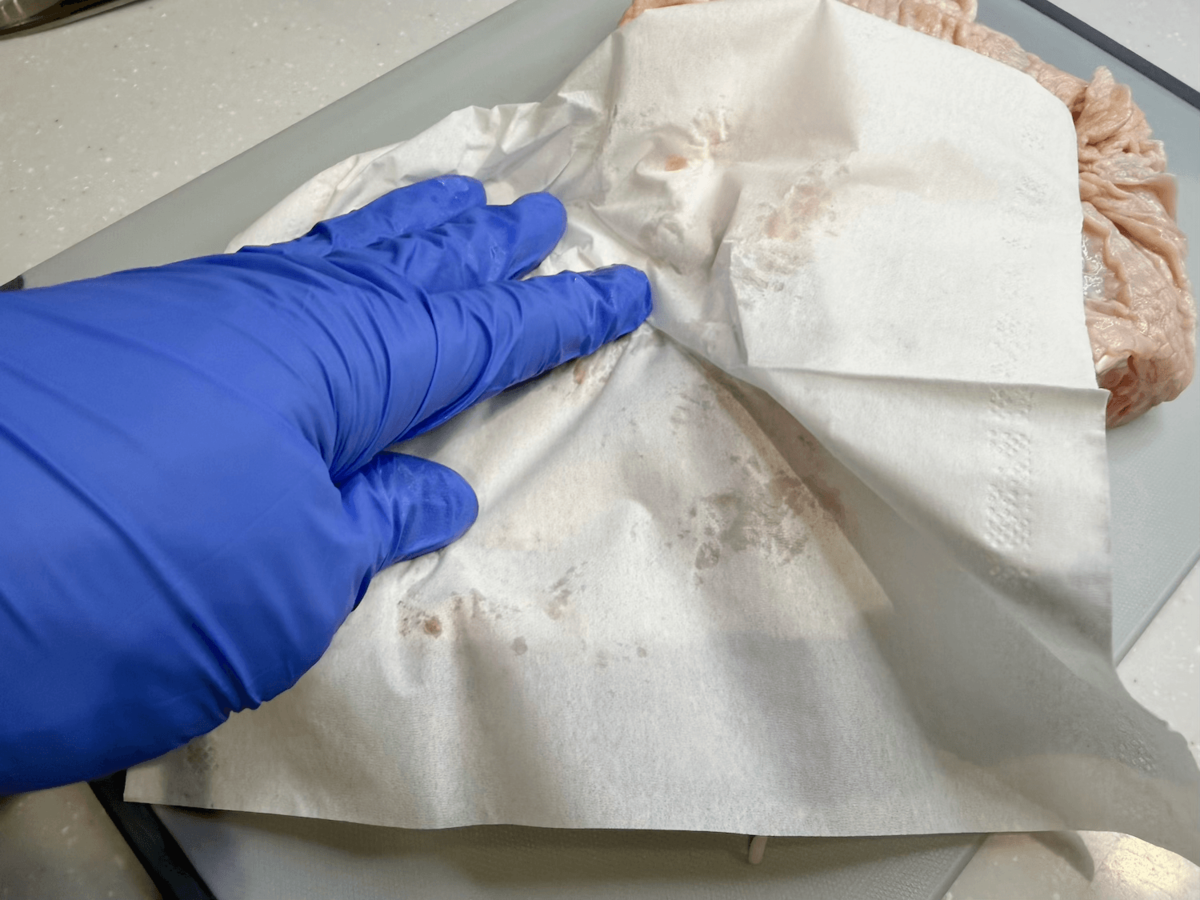 鶏肉の表面についた余分な水分(血液やドリップ)を、キッチンペーパーでしっかり拭き取ります。