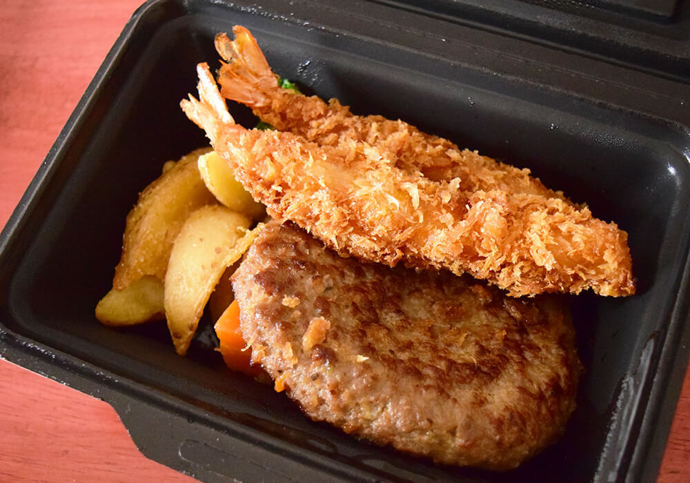 そんな「ステーキのあさくま」では、お持ち帰り弁当も販売されています。今回は、「学生ハンバーグ弁当」と「あさくまハンバーグとエビフライ2尾(おかずのみ)」を実際に食べてみたので、その内容を紹介します。