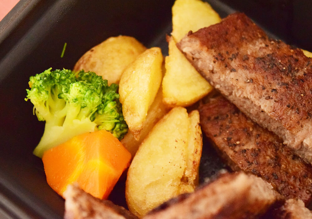 学生ハンバーグの下には、ポテト・ブロッコリー・にんじんが添えられています。中でもポテトはほくほくとした食感が印象的で、満足度の高い仕上がりです。ステーキソースと絡めて食べると、さらにおいしさが引き立ちます。