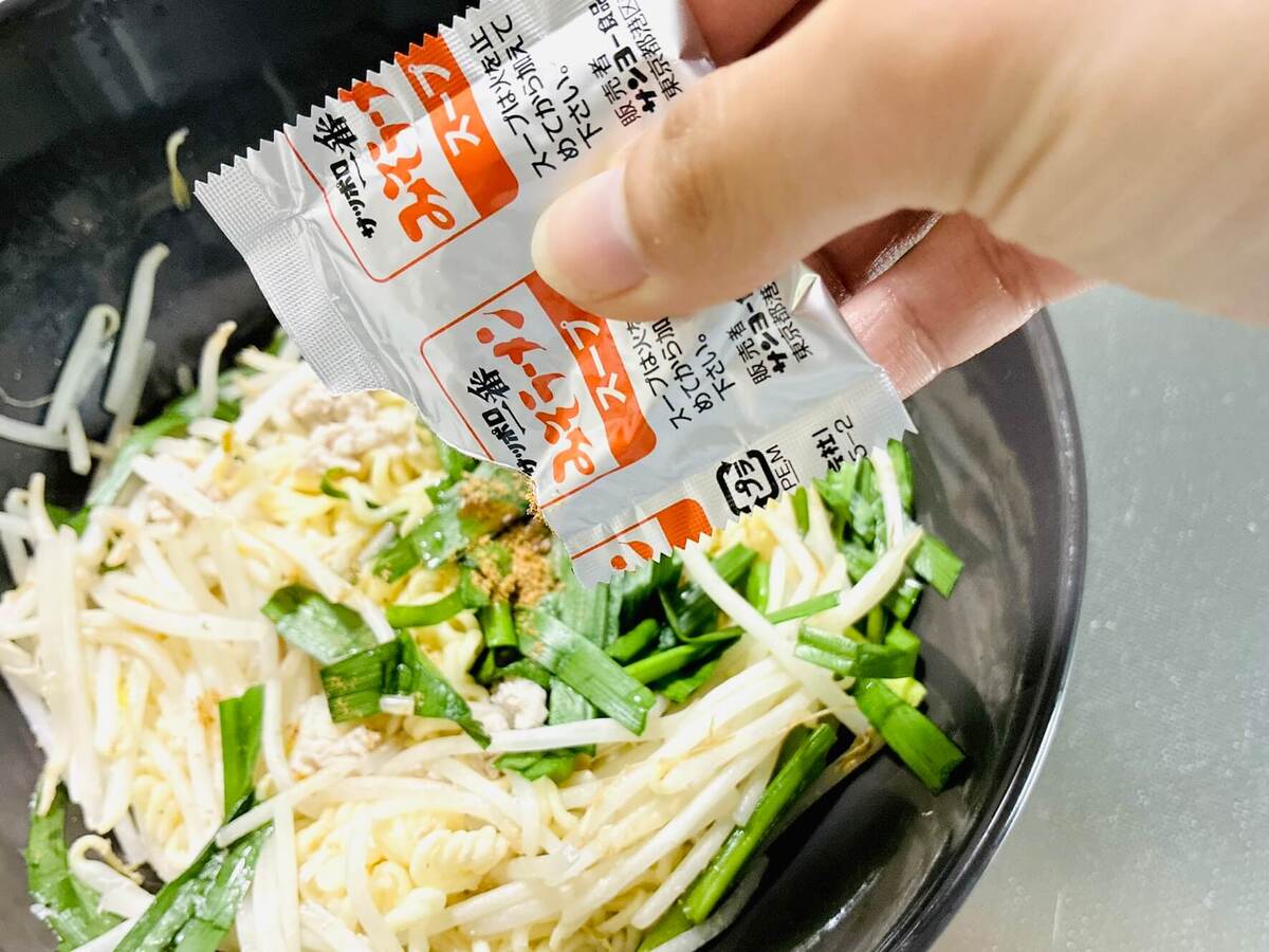 付属の粉末スープを3/4袋~1袋かけ、残しておいたゆで汁を加えます。