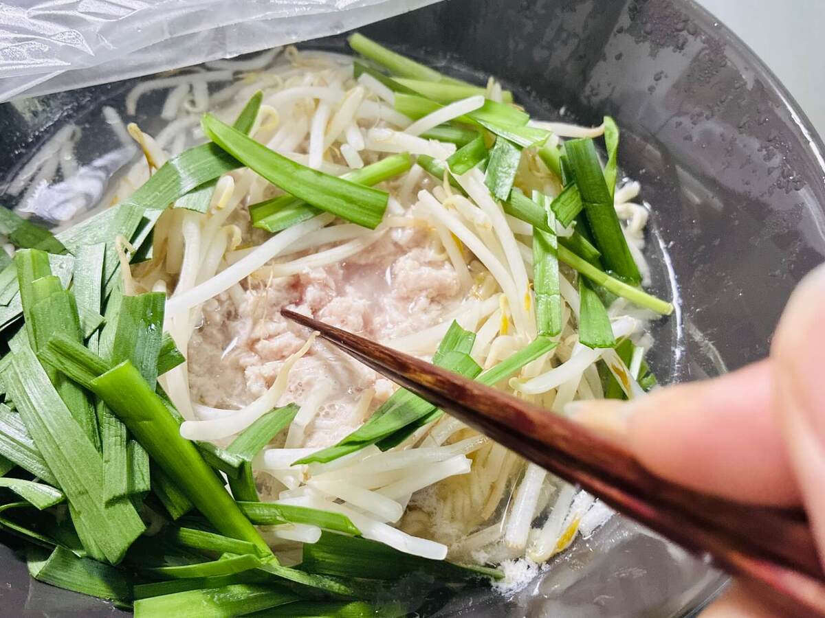 気を取り直して、豚ひき肉ともやし、ニラを入れました!