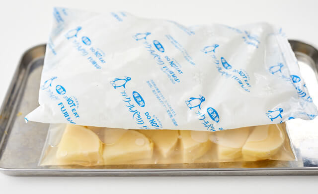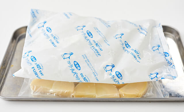 金属製バットに置き、上に保冷剤をのせて冷凍します。冷凍庫で1ヵ月程度保存可能です。
