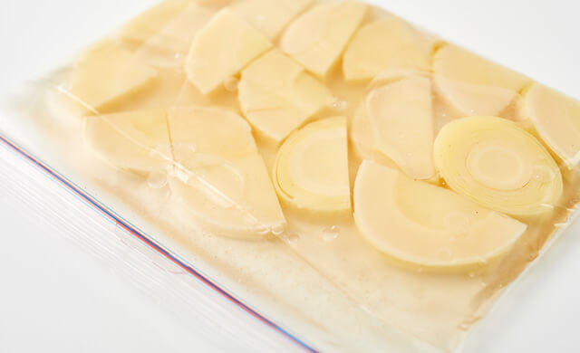 「①だし汁を使った冷凍方法」では、たけのこだけを料理に使いたい場合、鍋で沸騰させてだし汁と分ける必要がありますが、こちらの方法ならそのまま使えます。