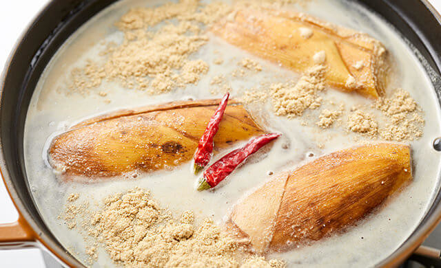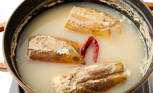 たけのこ2~3本に対して、米ぬか1カップと赤唐辛子2本が目安。水はたけのこがかぶるまで入れます。