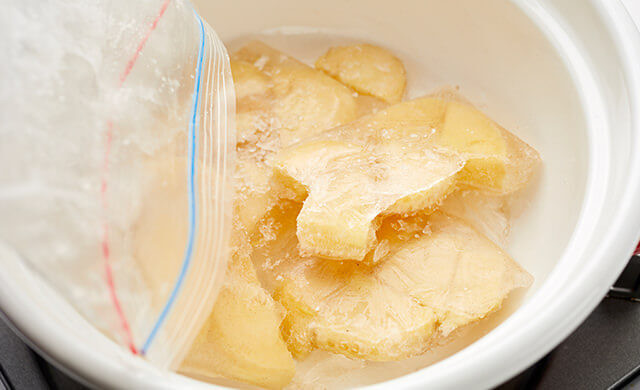 たけのこをだし汁ごと冷凍用保存袋から出して鍋に入れ、火にかけて沸騰させてから使用しましょう。