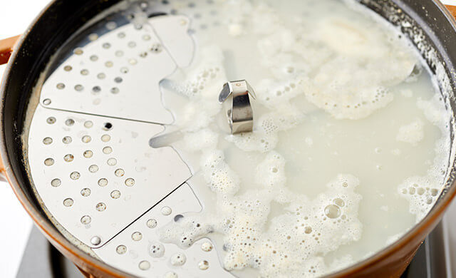 落としぶたをするのは、たけのこが浮いて空気に触れると酸化して色が悪くなるため。沸騰後は、吹きこぼれないように弱火にします。
