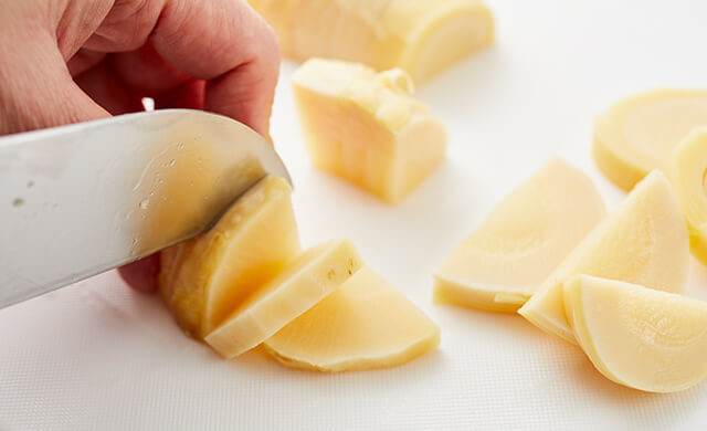 アク抜き済みのたけのこを切ります。先端の数センチは輪切り。その下は2つ割りか4つ割りにし、厚さ5mm以下の半月切りまたはいちょう切りにします。