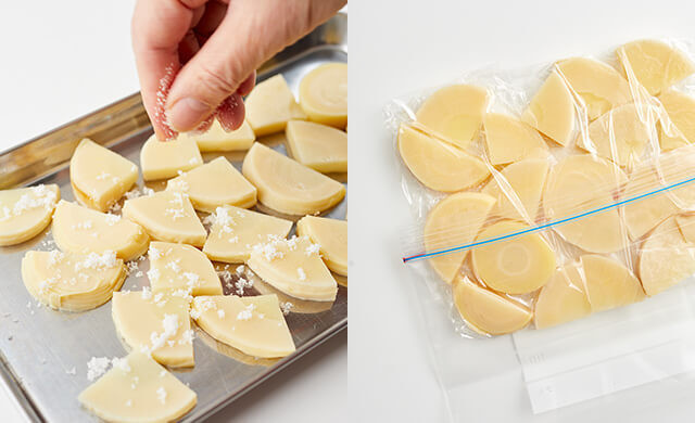 砂糖がたけのこの表面をうっすらと覆うように、両面にまんべんなくまぶしましょう。1回使用分ずつラップに包み、冷凍用保存袋に入れ、袋の口を閉じます。