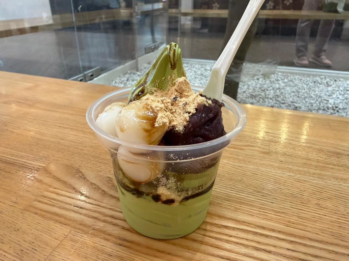 私が食べた「抹茶きなこソフト」は、お茶の風味がしっかり感じられるのに甘すぎず、後味はさっぱり。